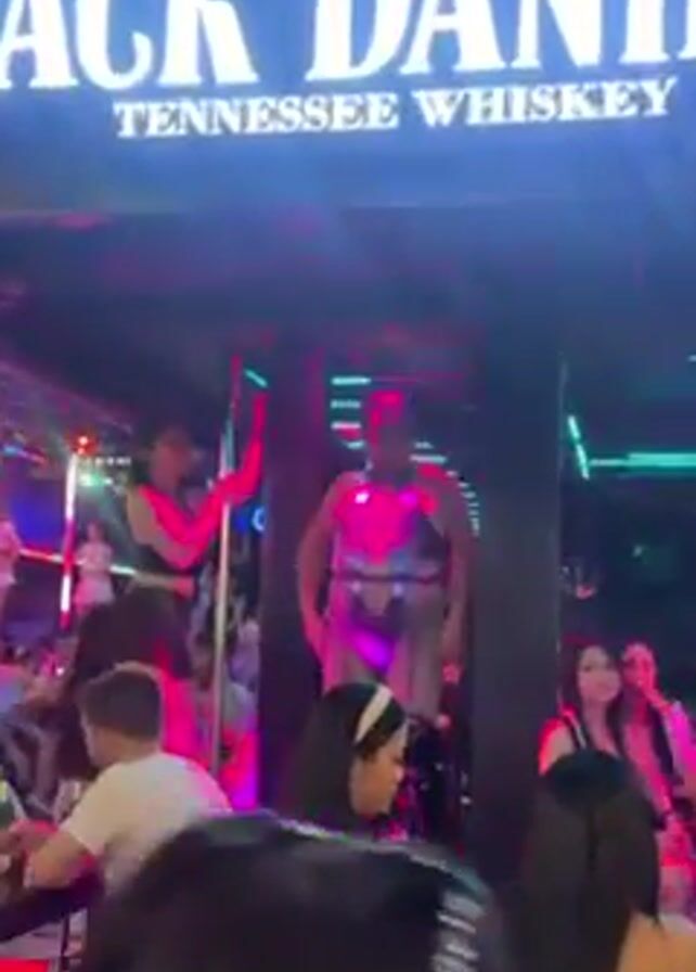 The video depicts a crowded bar with a prominent Jack Daniel's sign. The scene features two pole dancers performing, one in a black outfit, the other in a silver one-piece. Patrons are seated at tables, and some are standing, engaging in conversations and watching the dancers. The bar is illuminated with various colorful lights.