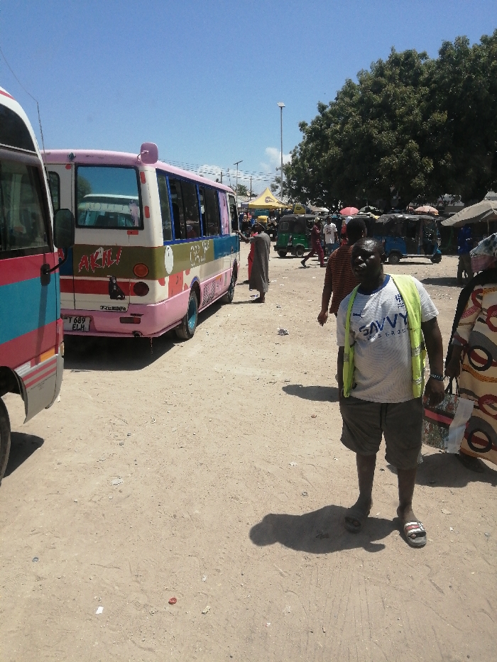 A busy, sunlit outdoor scene with sandy ground features a man in a white t-shirt and yellow vest in the foreground. Behind him are people walking, including a woman carrying a bag. Several colorful buses are parked to the left, with a yellow tent and green tuk-tuks visible in the background. A tall light pole stands in the distance under a blue sky, with a large tree providing shade to the right. The overall atmosphere suggests a lively marketplace or transportation hub.