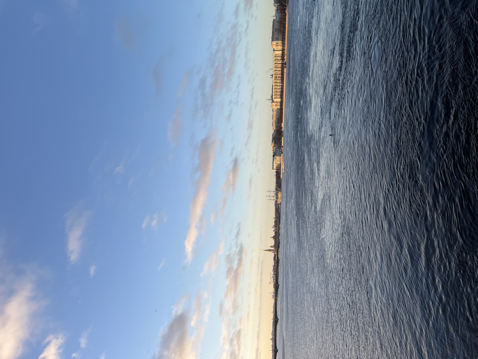 An outdoor panoramic image captures a wide view of the Neva River in Saint Petersburg, Russia. The scene is illuminated by low-angle sunlight, indicative of either early morning or late afternoon, with a clear blue sky overhead transitioning to a lighter blue with scattered white and light orange-tinted clouds near the horizon. The foreground and midground are dominated by the dark, rippling surface of the Neva River, showing distinct currents and subtle wave patterns. No identifiable vessels or persons are present on the water in the immediate vicinity. Along the far bank, the city's landmarks are visible from left to right: A multi-arched bridge, identified as the Birzhevoy Bridge, spans the river. Centrally positioned is the Peter and Paul Fortress on Zayachy Island, prominently featuring the golden spire of the Peter and Paul Cathedral. To the right of the fortress, a three-masted sailing ship is docked along the Petrogradskaya Embankment, partially obscured. Further to the right, a continuous stretch of multi-story, classical-style buildings, characteristic of the Palace Embankment in the city's historic center, lines the riverbank, their facades brightly lit by the direct sunlight. No individuals or specific actions are discernible within the frame.