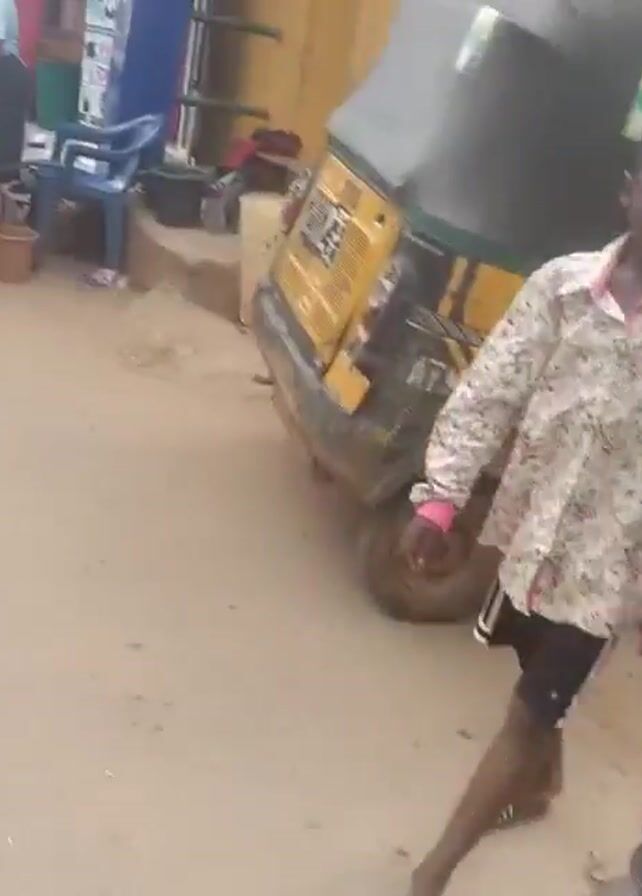 two different scenes. The first scene shows two people next to a motorized rickshaw. The person in the rickshaw is partially visible and wearing black. The other two people are standing next to the rickshaw, and are also wearing black. The second scene shows a man and a woman standing next to a motorbike. The man is wearing a light-colored shirt and black shorts, and the woman is wearing a light blue shirt and black skirt. There is a blue plastic chair and a brown bucket next to them. There are other people visible in the background.