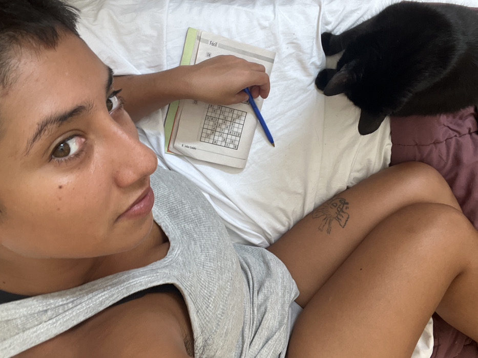 The image depicts an indoor scene on a bed covered with white sheets and a reddish-brown blanket. No explicit visual identifiers within the image directly indicate a specific location in Buenos Aires, Argentina. A light-skinned individual, likely female, with short dark hair, is positioned in the upper left portion of the frame, looking directly into the camera. She wears a light gray ribbed tank top. Her left arm rests on the white sheet, holding an open puzzle book. The book displays a Sudoku grid and the words "Sudoku" and "Fácil" (Spanish for "Easy"). A blue ballpoint pen is held in her left hand, resting on the puzzle book. A black outline tattoo, depicting a stylized sun with a face, is visible on her upper right thigh. In the lower right quadrant of the image, a black cat is lying on the white sheet, facing away from the camera, with its back, head, and ears visible.