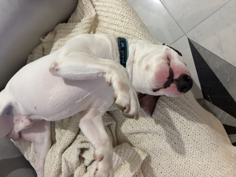 - "A white bull terrier sleeps curled on a beige knitted blanket" by FM-4zhu12, licensed under CC BY 4.0
