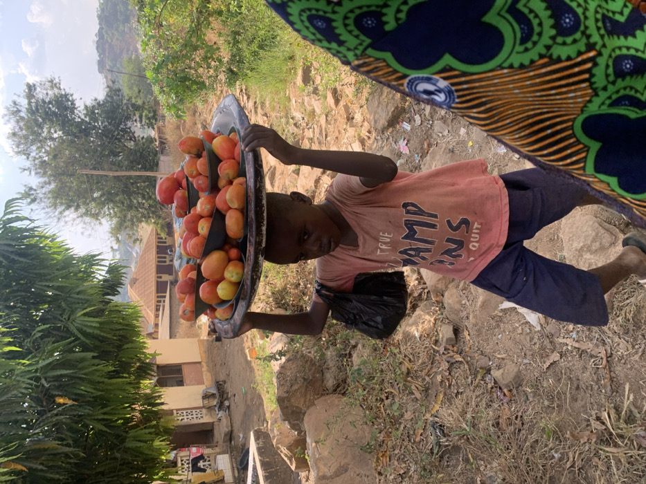 - "A young male child, estimated to be between 6 and 10 years old, stands outdoors in a residential area of Okengwe - Obehira, Nigeria, carrying a large, dark circular tray laden with tomatoes on his head" by FM-NEBU82, licensed under CC BY 4.0