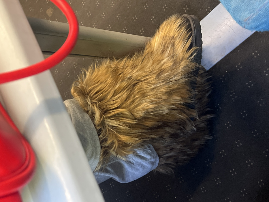 A close-up, ground-level view inside a public transport vehicle, consistent with a train or coach, located in or around the city of Brighton, United Kingdom. The primary subject is a person's right lower leg and foot, clad in a large, shaggy, light brown faux-fur boot or slipper featuring a thick, dark sole. The fur is multi-tonal, ranging from light brown to ginger with darker undertones, extending significantly up the calf, partially obscuring light grey fabric, likely trousers or leggings. The foot rests on a dark grey carpet patterned with repeating small, light grey squares or diamonds. A light grey or metallic rectangular footrest or partition is situated on the floor in front of the boot. Above the leg, a white horizontal surface, consistent with a seat-back table or shelf, is partially visible, supported by a light-colored vertical pole. A bright red, curved strap or cable is prominently positioned in the upper right portion of the frame. A small section of a second individual's lower leg, clad in blue fabric, is visible in the lower right corner, beyond the footrest.