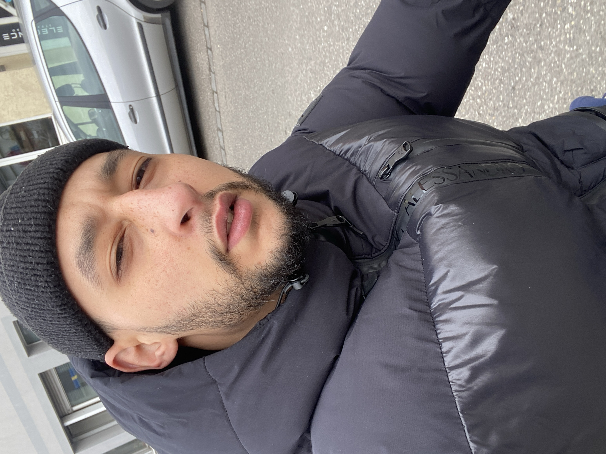A man wearing a black beanie and a puffy black jacket is looking at the camera. The man has facial hair. A silver car is visible in the background, along with buildings. The image was taken outdoors. The visible text on the car indicates that the location is Schiltigheim, France.