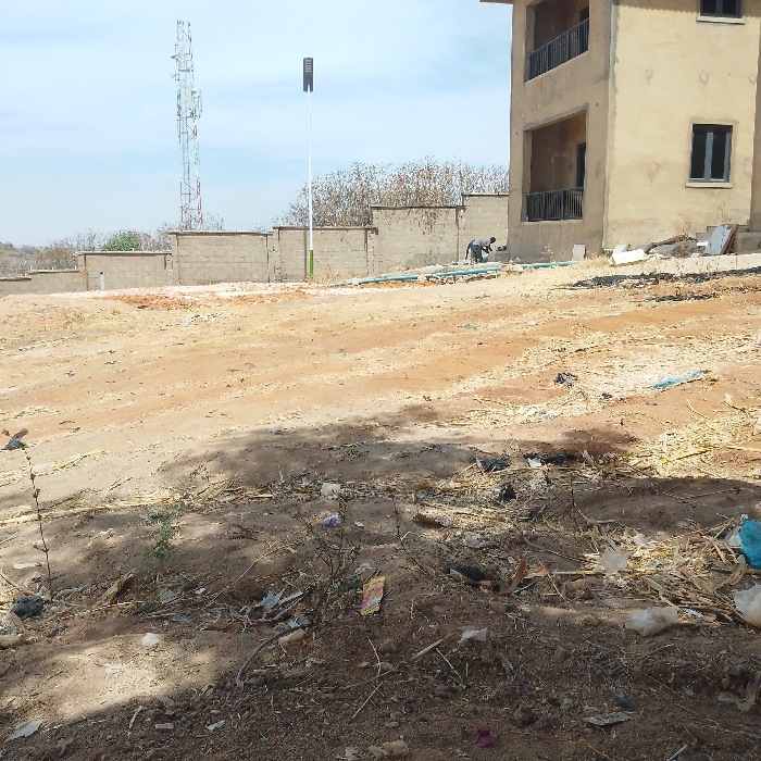 This image captures an outdoor scene in Jos, Nigeria, depicting an unpaved, dusty area adjacent to a construction site under a clear sky. In the foreground, the ground consists of dry, reddish-brown soil with sparse, withered vegetation and scattered litter, including plastic bags, wrappers, and dried plant debris. The midground presents an expanse of similar reddish-brown dirt, appearing uneven and disturbed. The background features several structures and elements. To the far left, a tall, red and white lattice telecommunications tower stands prominently against the horizon. Running horizontally across the mid-background is a partially constructed perimeter wall made of concrete blocks, behind which dry shrubs or small trees are visible. A tall, slender white pole topped with a black solar-powered street light fixture is positioned centrally. To the right, a two-story building is under construction, characterized by its unfinished light brown/beige concrete exterior. It features two visible balconies with black metal railings and dark-framed windows. One individual, a male wearing dark clothing, is observed stooping or kneeling near the base of the unfinished building, engaged in an undetermined activity, possibly related to construction or plumbing. Blue pipes run along the ground in the vicinity of the wall and the building. The overall environment suggests ongoing development in a semi-arid setting.