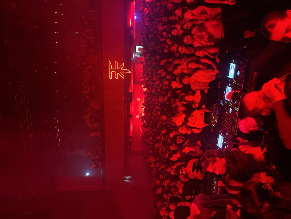 A vertical eye-level shot of a nightclub bathed in red light. A densely packed crowd of people fills the space, faces tilted upwards. To the right, a DJ booth with equipment and figures operating it. On the left, a wall with a neon logo illuminated. The scene is energized and filled with the excitement of a concert or dance venue.
