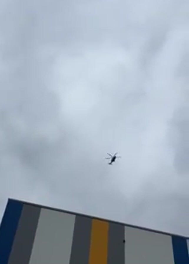 helicopter flying in a cloudy sky. The helicopter is black and appears to be moving away from the viewer. A corner of a building with blue, gray, and yellow stripes is visible at the bottom of the frame. The sky is overcast and gray.