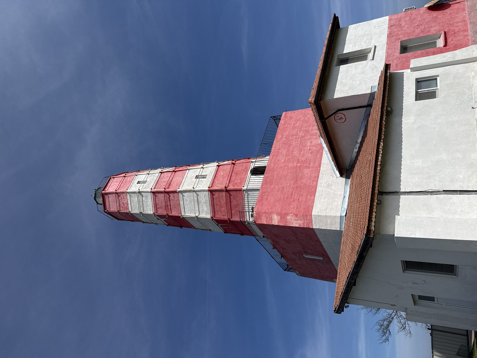The image displays the Shabla Lighthouse, located in Shabla, Bulgaria, under a bright blue sky with minimal high cirrus clouds. The central feature is a tall, tapering lighthouse tower, characterized by alternating horizontal bands of red and white paint, each band approximately uniform in height. Small, rectangular, multi-pane windows are visible along the tower. At its apex, a dark lantern room is present, surrounded by a black metal railing defining an observation platform directly beneath it. The tower ascends from a broader, multi-sided base section, which is predominantly red and also features a black metal railing delineating a lower platform. Adjoined to this base are several single-story ancillary buildings, primarily white with sections painted red, all featuring red-tiled hip roofs. These buildings are equipped with rectangular windows, some containing internal blinds. A red circular emblem, resembling a bicycle symbol, is visible on a white wall section of one attached structure. Minor cracking is visible on the white exterior walls of the ancillary buildings. Patches of green ground cover and a light-colored corrugated metal fence are present in the lower left foreground, alongside a portion of a bare tree. No people are visible.