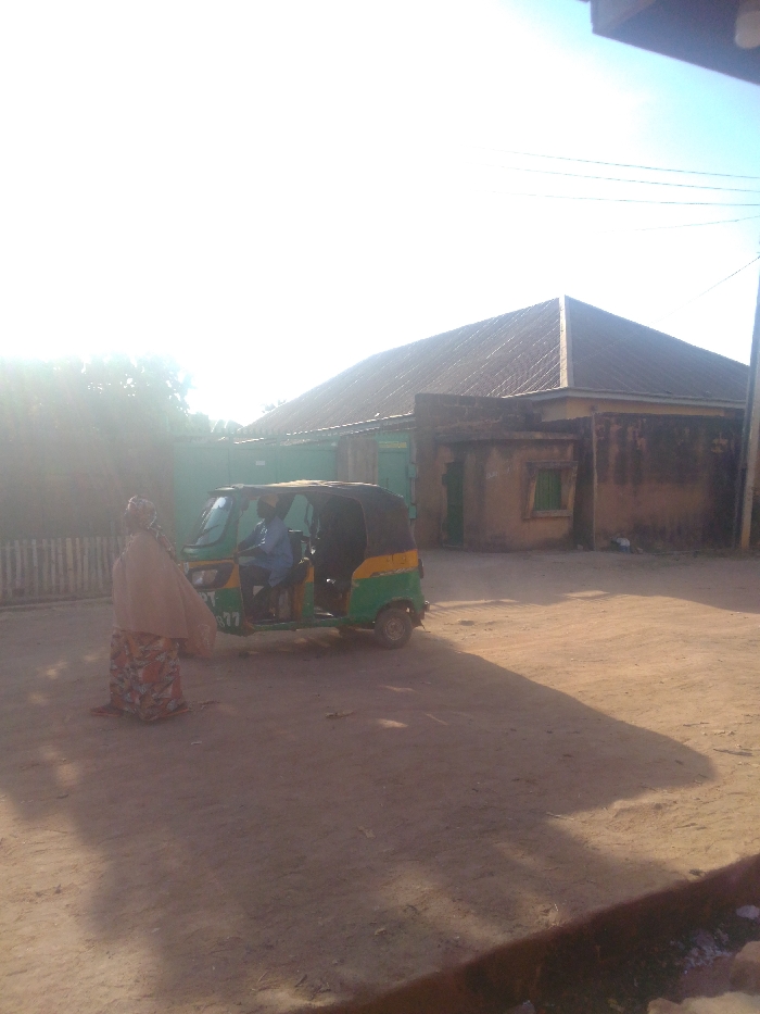 This image captures an unpaved street scene within the city of Jos, Nigeria, during daylight hours with strong, low-angle sunlight causing significant lens flare on the left and casting long shadows. In the mid-ground, a green and yellow motorized tricycle (Keke Napep) is stationary. A partial registration plate, "PT B77", is visible on its front. A driver, wearing a light blue/grey shirt and a cap, is seated behind the handlebars. To the left of the tricycle, a person, likely female, stands with their back to the camera, wearing a patterned long skirt and a plain, light-colored shawl draped over their head and shoulders, appearing to interact with or prepare to board the tricycle. The background features a weathered, single-story building with a brown/tan facade and a dark, ridged roof. It has at least two green-painted doors and one green-painted window. To the left of this building, a green metal gate and a light-colored fence are visible. The ground consists of reddish-brown dirt, displaying tire tracks and foot impressions. Overhead power lines are visible against the clear sky in the upper right quadrant of the image.