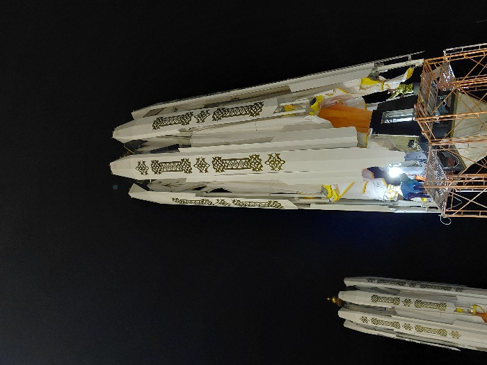 The image depicts a nighttime scene at the Baiturrahman Grand Mosque in Banda Aceh, Indonesia. A large, white minaret in the foreground, adorned with gold geometric patterns, is either under repair or significantly damaged. Multiple outer panels are torn or absent, revealing internal orange-yellow material and darker structural components. A multi-level metal scaffolding structure surrounds the lower section of this minaret. At least three individuals, identified as workers, are present on the scaffolding platforms and within the exposed structure, illuminated by bright artificial lights. Torn yellow and white sheeting hangs from damaged areas. To the left, in the mid-ground, a second, smaller minaret of similar architectural design stands intact. The sky is dark and clear.