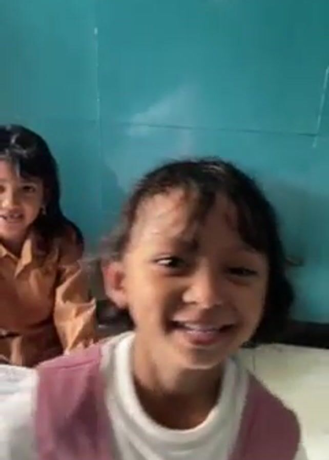 Two young girls are sitting on the floor against a teal wall. One girl is wearing a brown uniform and is seated in a cross-legged position. The second girl is wearing a white top and a pink vest and is kneeling on the floor. They both smile at the camera and the girl in the pink vest says “Assalamualaikum”.