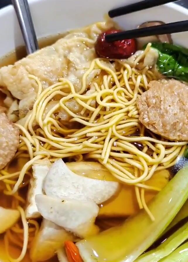 A close-up shows a bowl of noodle soup