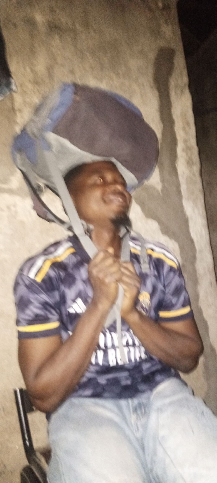 A dark-skinned adult male is depicted seated against a rough, light-colored wall in Sabon Tasha, Nigeria. He wears a dark blue patterned short-sleeved shirt with yellow and white shoulder stripes, featuring a white Adidas logo, and light blue jeans. A blue and grey backpack is positioned over his head, with its straps held by both of his hands in front of his chest. His head is tilted slightly back and to the right, with a visible grimace or strained expression on his face. His eyes appear closed or rolled upwards. A portion of a dark-colored chair or stool is visible beneath him on the left. The scene is dimly lit, casting shadows on the wall behind the individual.