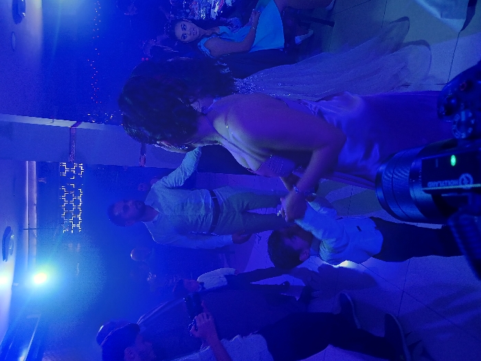 A group of people are captured in a blue-lit indoor scene. A woman in a long, light-colored dress is central, possibly the focus of a filming or photography setup. A man in a light-colored shirt and pants stands nearby. A camera is present in the frame. The lighting gives the scene an artificial, cool tone. The tiled floor suggests the location could be a studio or event space.