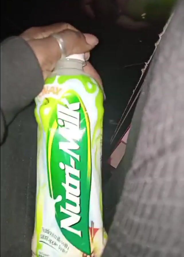A person in a car holds a bottle of Nutri-Milk Apple Blast drink in their hand