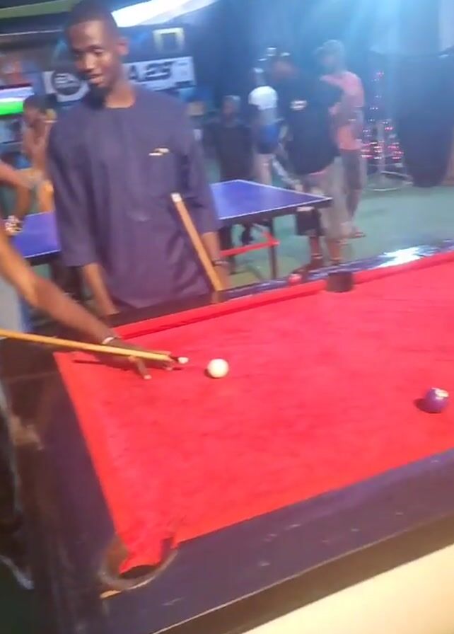 The scene captures an outdoor gathering with a red pool table as the focal point