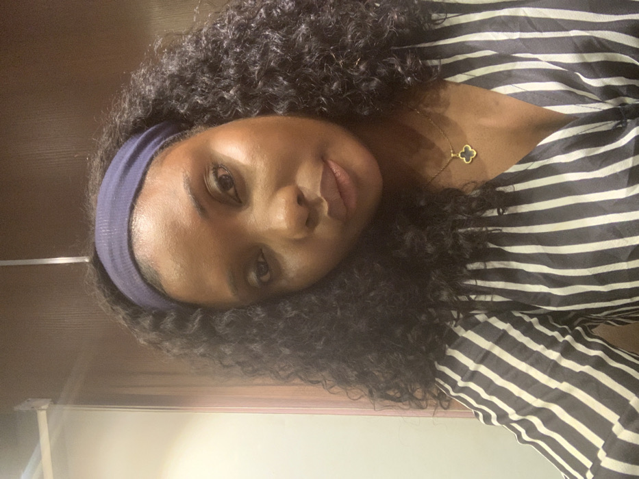 The image displays a head and upper torso selfie of a dark-skinned female, appearing to be a young adult, positioned indoors