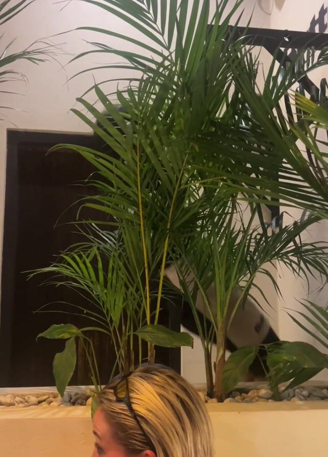 Here's a detailed description of the video: Setting: The video is shot indoors, likely in a restaurant or club, based on the decor and ambient sounds. People: The primary focus is on a woman with short, blonde hair. She is wearing sunglasses pushed up on her head. The background shows a person briefly walking behind a planter and out of sight. Objects: Several tall, green palm-like plants fill a planter. White decorative rocks surround the base of the plants. Above the planter, a section of the white wall displays part of a logo or sign, possibly for the establishment. A black speaker is mounted high on the wall. Actions: The woman seems to be sitting and talking, possibly eating something, as she gestures near her mouth. The other person in the background is walking briefly visible behind the plants. Interactions: There is likely a conversation taking place, although only the side profile of the woman is visible. Sounds suggest shouting or chanting is present. Environment: The environment feels lively, with background noise indicating other people are present. The interior design includes simple white walls and some dark-colored accents.