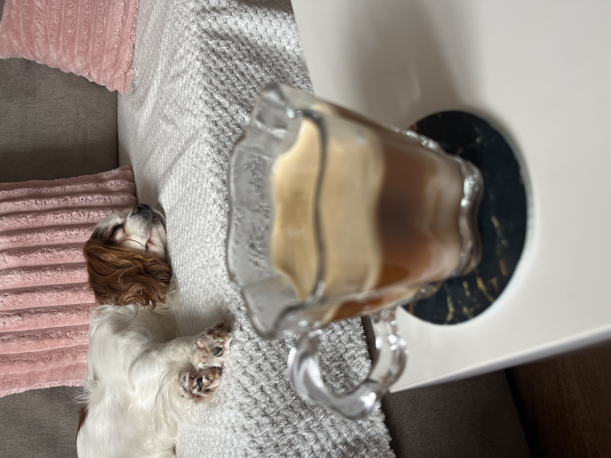 A Cavalier King Charles Spaniel lies on a white blanket on a gray sofa with a pink pillow. Next to the sofa is a white table with a cup of coffee on it. The location is not indicated in the image.