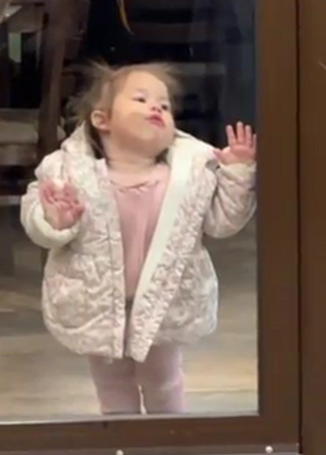 A young child in a pink outfit and patterned jacket stands inside a building, pressing their hands against a glass window. The child looks upwards with a slightly pursed expression. Behind the child, chairs and figures can be seen through the glass. The floor beneath the child is tiled. The light is muted and the setting appears to be a public space, possibly a restaurant or store. Music is playing in the background.
