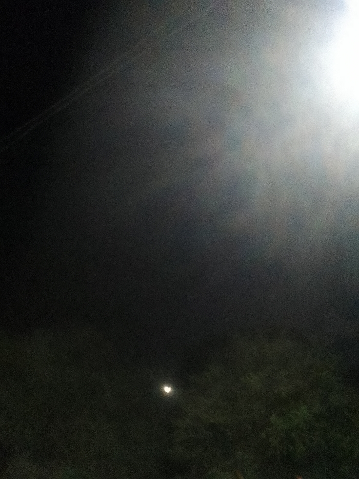 The scene depicts a dark night in the city of Unknown, Unknown, characterized by low visibility, possibly due to fog or atmospheric haze. An intensely bright, overexposed light source occupies the upper right portion of the frame, casting a strong glare. Two faint, parallel diagonal lines, suggestive of utility wires or cables, are visible against the dark sky in the upper left. A small, distinct crescent-shaped light, consistent with the moon, is present in the lower-middle left. The lower section of the image contains dark, indistinct shapes that appear to be foliage or tree canopy. No individuals, specific actions, or interactions are observed.