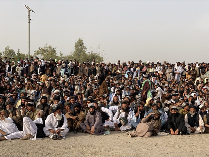 A large group of men, estimated to be over 200, are gathered in an open field, sitting on the ground in rows facing a direction not visible in the image. They are mostly dressed in traditional Afghan clothing, including long tunics and turbans. Some men are wearing more modern clothing, including jeans and t-shirts. The environment is dry and dusty. There is a single streetlight with a solar panel visible in the background, along with some sparse trees. The scene is likely in Sard-E ‘olya, Afghanistan, based on the provided coordinates. The men appear to be attending a gathering or event, possibly a religious or political event. No women or children are visible in the image. The men's facial expressions are generally neutral, although some appear to be engaged in conversations with others. There is no evidence of any action or interaction beyond the men sitting and talking amongst themselves. The scene appears to be peaceful and orderly.