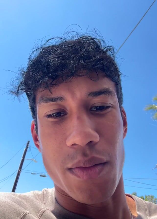 close-up shot of a young man with dark, curly hair and light brown skin. He is wearing a tan crewneck sweatshirt. He looks directly at the camera, speaks, and occasionally glances upwards. Behind him, the bright blue sky is visible, along with utility poles, wires, and a glimpse of a palm tree. The video seems to have been recorded outdoors during the daytime. The man mentions his car being dirty and needing to go get it cleaned.
