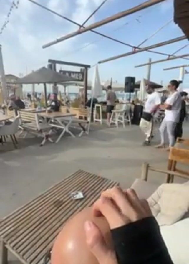 view from what appears to be a patio seating area, possibly at a beachside establishment. A person is patting their bald head while seated at a wooden table. In the background, several people are walking around, and music is playing, probably from a portable speaker. The area is decorated with white umbrellas and casual beachside furniture. The sign with "La Mer" is visible. The weather is sunny with some clouds.