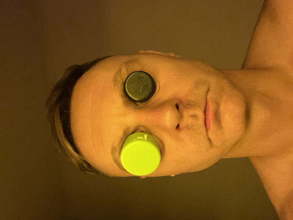 A light-skinned man tilts his head to the left, looking directly at the viewer. A green bottle cap is positioned over his left eye, while a coin covers his right eye. The image is bathed in a yellow light, casting shadows on his face and neck. He has short brown hair, and a slightly bemused expression. The background appears to be a plain wall.