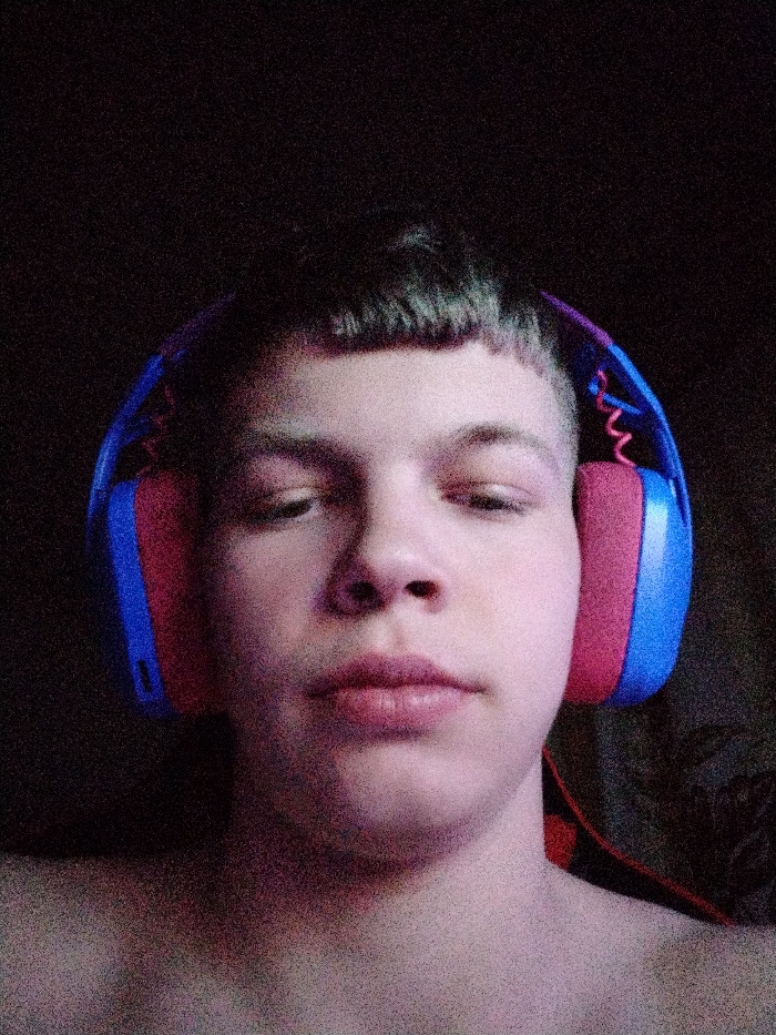 A close-up, frontal portrait of a single young male individual is depicted in an indoor setting within Balgarski Izvor, Bulgaria. The subject, centered in the frame, has fair skin, short dark hair with bangs, and heavy-lidded eyes. He is wearing over-ear headphones, featuring blue headbands and outer shells, with pink/red ear cushions; a coiled cable is visible on the right side of the headband. The subject's bare shoulders and upper chest are visible. The background is predominantly dark and indistinct, showing significant digital noise, with a faint dark patterned texture discernable in the upper right quadrant and a red and black element partially visible behind the subject's right shoulder. Illumination appears to originate from the front.