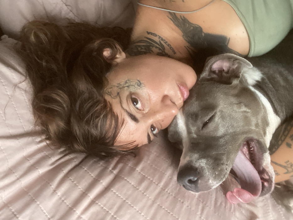 - "A person with brown curly hair and face tattoos is lying on a pink quilted bed next to a gray and white pitbull" by FM-nGep32, licensed under CC BY 4.0