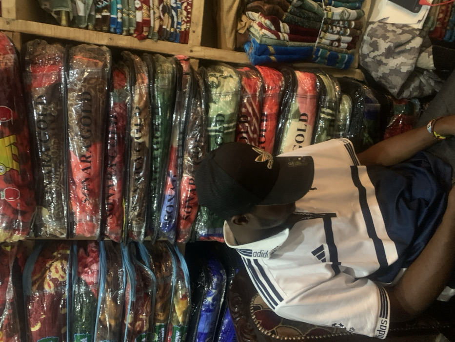 A person wearing a black cap and an Adidas shirt sits in front of a shelf lined with packages. The packages are filled with items labeled "SONARA GOLD" and feature various designs, including floral patterns, leopard prints, and cartoon characters. More packaged items are stacked on shelves above.