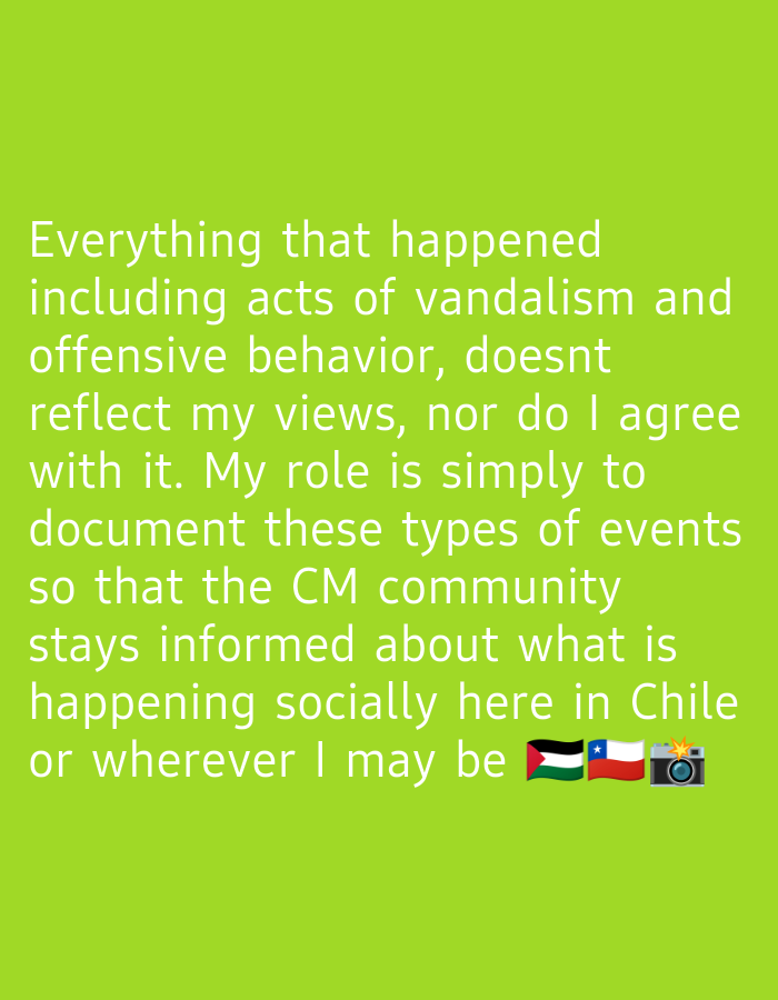 A green background features white text. The message asserts that actions including vandalism and offensive behavior don't reflect the author's views, and they disagree with them. The author's role is to document these events to keep the CM community informed about social happenings in Chile or wherever they may be. A Palestinian flag, a Chilean flag, and a camera emoji accompany the text.