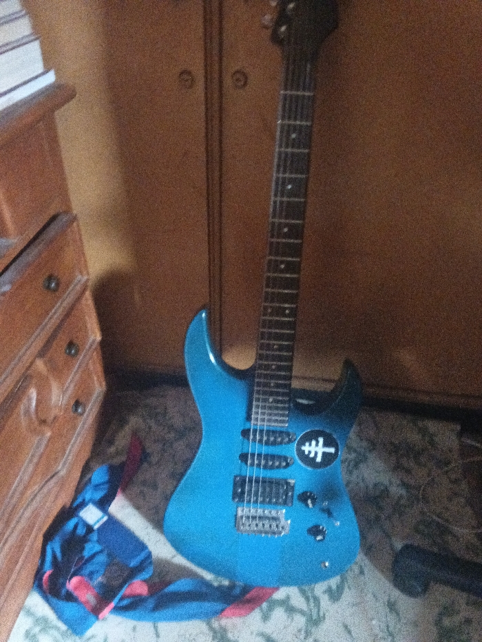 The scene depicts an indoor setting within the city of Dogsenang Gorphoog, Bhutan. A metallic blue electric guitar, featuring a black headstock, dark fretboard, multiple pickups, and a tremolo bridge, leans against a brown wooden wardrobe. A circular black decal with a white stylized key or cross symbol is affixed to the guitar's body. To the left, a multi-drawer brown wooden dresser with dark circular knobs is partially visible, topped by stacked light-colored objects, possibly books. A crumpled fabric item displaying blue, red, and black patterns lies on the floor near the base of the dresser and guitar. The floor surface exhibits a light-colored, mottled pattern. A small black object is partially visible on the floor to the right of the guitar's base. No individuals are present.
