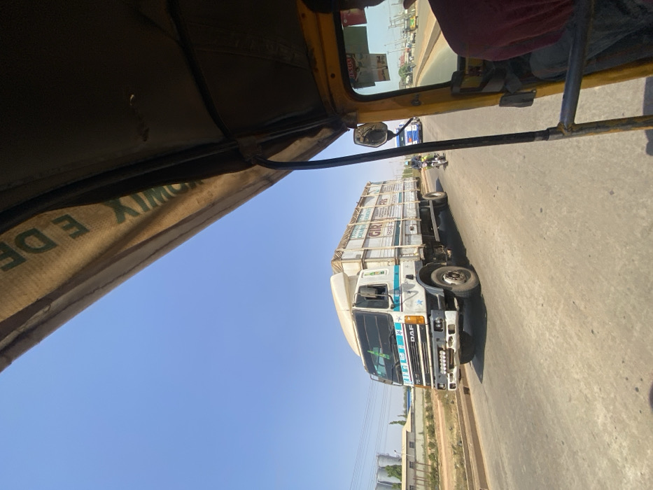 A view from inside a yellow vehicle, possibly an auto-rickshaw, shows a road scene on a sunny day. A large white truck with a tall load is visible, dominating the frame. The truck has a blue and green design and the word "DAF" on the front. The road appears to be asphalt. Some buildings and greenery are visible in the background. The auto-rickshaw's canvas roof is partially visible on the left.