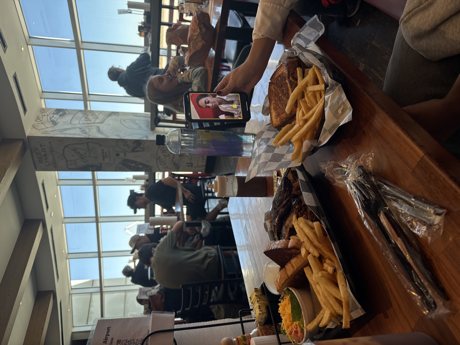 This image depicts an interior scene within a restaurant, likely an airport establishment given the visible "Airport" sign and the distant view of the Tower of the Americas, placing the location in San Antonio, Texas, United States. In the foreground, a wooden table is laden with food. Two black plastic trays, lined with black and white checkered paper, hold substantial meals. The left tray contains barbecue meat (including ribs and brisket), Texas toast, french fries, and a side salad. The right tray holds a grilled cheese sandwich and french fries. A clear plastic water bottle, a squeeze bottle of barbecue sauce, and a condiment caddy are also on the table. Two sets of individually wrapped plastic cutlery are positioned between the trays. A person's arm and hand are visible on the right, holding a smartphone engaged in a video call; the screen displays a woman in a white collared shirt. Partially visible legs below the table suggest the person is seated. In the mid-ground, a young female with long hair is seated at an adjacent table, smiling and looking towards the smartphone. The background features large, expansive windows offering a clear view of a blue sky and distant urban structures, including the distinctive silhouette of the Tower of the Americas. Several other patrons, predominantly male and casually dressed, are seated at various tables throughout the restaurant, some engaged in conversation. A prominent structural pillar in the mid-ground is decorated with a "BEEF CHART" illustrating different cuts of meat.