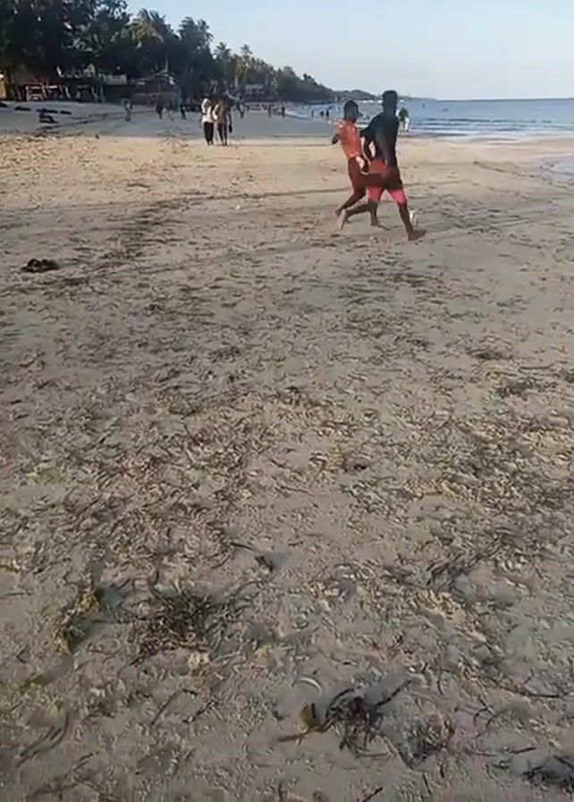 On a beach with tan sand, several people are visible in the background. There are palm trees and buildings with thatched roofs in the distance. A group of young men are playing with a soccer ball. One man dribbles the ball, then later two men face each other, volleying the ball with their heads. Scattered debris is visible on the sand in the foreground. The sky is clear and light blue.