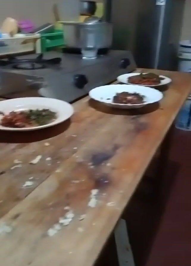 The video depicts a partially messy kitchen counter made of light-colored wood, featuring three plates of prepared food. Each plate contains a mixture of red and green ingredients, seemingly a main dish with a side vegetable. A spoon rests on one of the plates. To the left of the plates, a black-handled knife lies on the counter. Behind the plates, a silver gas stovetop is visible. Behind the stovetop, is a shelf unit, with various kitchen supplies and items, including a red and white jar. In the background, there is a stainless steel refrigerator and stacks of white plastic buckets.