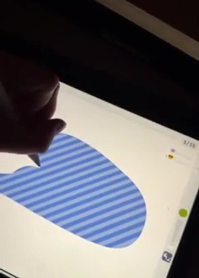 A hand is drawing a green outline on a blue-striped shape on a white screen of a tablet