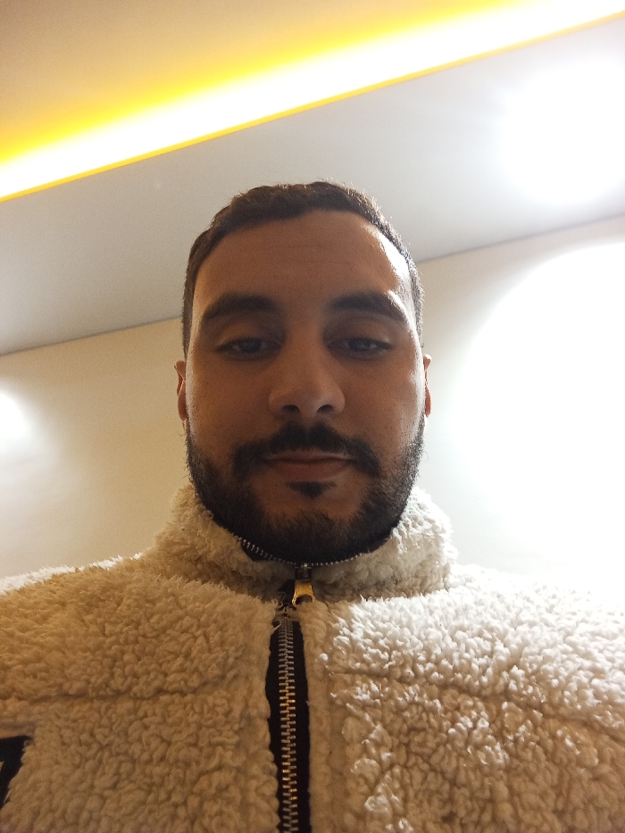 A man with short brown hair and a beard is centered. He is wearing a white, fluffy, zippered jacket. The zipper is partially visible. Above him, the ceiling is illuminated with a bright yellow light bar. To the right of the man, the wall appears a faded white, with a diffused circle of light. The photo is taken at a close range, looking slightly upwards at the subject.