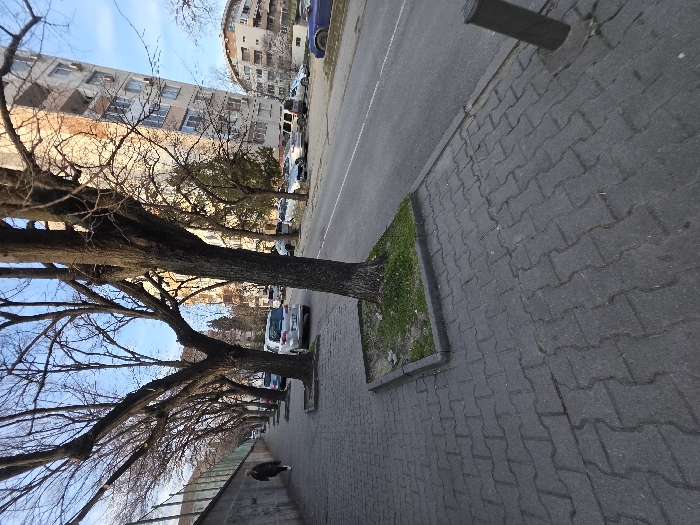 The image depicts a street scene in Stara Zagora, Bulgaria, viewed from a low angle on a paved sidewalk. The foreground features dark grey interlocking pavers and the base of a mature deciduous tree trunk, bare of leaves, within a square, raised concrete planter containing sparse green grass. A dark grey metal bollard is visible near the curb on the lower right. The midground includes an asphalt road with a solid white line and a dashed white line, indicating traffic flow or parking separation. A continuous line of similarly bare deciduous trees borders the left side of the road, each with an individual raised planter. Multiple vehicles are parked along both sides of the road; a silver SUV is prominent on the left, and various sedans and SUVs, including a distant blue vehicle, are visible on the right. A concrete retaining wall topped with a metal fence runs along the left edge of the sidewalk, sloping upwards. One individual, dressed in a dark coat and light trousers, walks away from the camera on this sidewalk, near the retaining wall. In the background, multi-story residential buildings are visible under a clear blue sky with minimal cloud cover. A tall, light-colored apartment building stands prominently on the right, illuminated by sunlight, while another building with a distinctive rounded roofline appears further down the street. The overall impression is that of a residential urban area during daytime, likely in late autumn, winter, or early spring due to the bare trees.