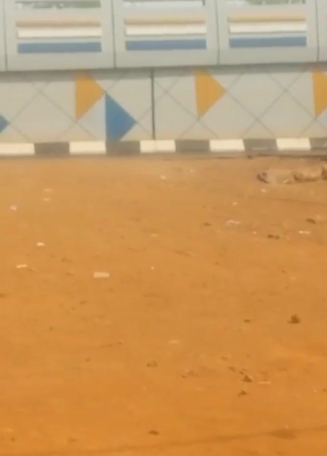 dusty, orange-colored ground in the foreground with a bridge in the background, featuring geometric patterns of white, blue, and yellow. Initially, a person is sitting near a makeshift structure under a dark umbrella to the right. A motorcycle drives by from left to right, then a sign partially obstructs the view on the left. Another motorcycle passes in the same direction. A communication tower is also visible in the distance.