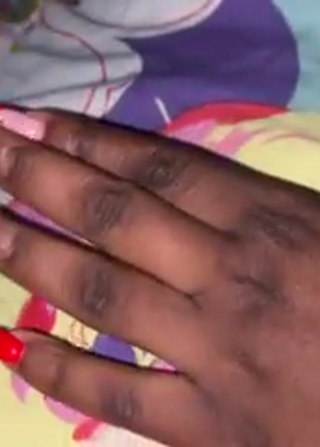 A close-up shot shows a person's left hand with long, pointed nails painted in a mix of red and light pink designs