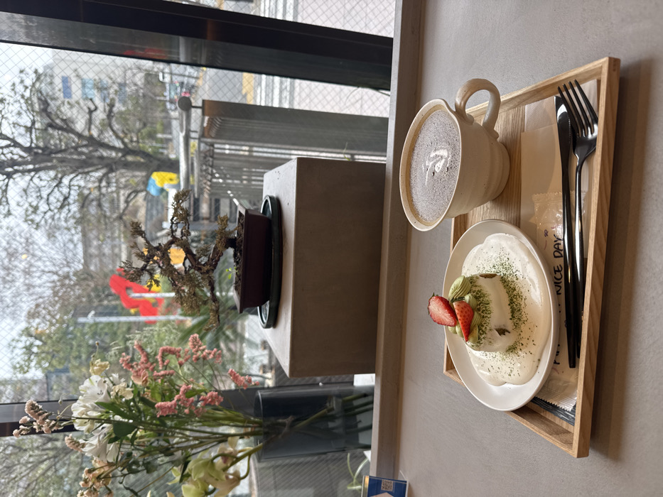 A tray holds a cup of dark liquid with a white swirl design, a dessert with strawberries, and black silverware. The tray sits on a light gray surface. Beside it is a bonsai tree on a gray block, and a vase of flowers. A window behind the block shows a city scene with trees and buildings.