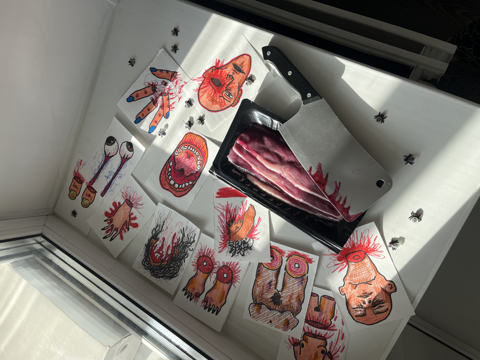A macabre display on a window sill features grotesque drawings of dismembered body parts, including severed heads, eyeballs, hands, and mouths, splattered with red ink resembling blood. These drawings are scattered around a meat cleaver, seemingly bloodstained, and a package of raw meat. Plastic flies are dotted around the scene, adding to the unsettling and gory aesthetic. Sunlight streams in, highlighting the disturbing imagery.