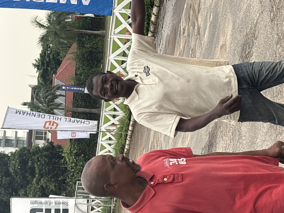 Two African men stand outdoors, one in a red polo shirt with "38 85" on the chest, gazing upward, and the other in a light yellow polo and jeans, grinning with an arm raised
