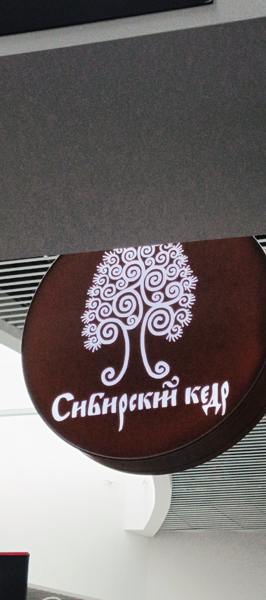 An upward-angled view captures a prominent, curved, dark brown overhead sign, internally illuminated with white Cyrillic text and a stylized white tree graphic. The text on the sign reads "Сибирский кедр" (Siberian Cedar). The sign is suspended within an indoor environment characterized by a dark gray ceiling in the upper portion of the frame and white walls visible below and to the sides. Horizontal linear grilles, likely part of a ventilation system or lighting fixture, are visible on both the left and right sides of the sign, blending into the background. No individuals, specific actions, or interactions are present in the scene. The location is an interior space within the city of Bolshoye Savino, Russia, consistent with a modern commercial or public building interior.