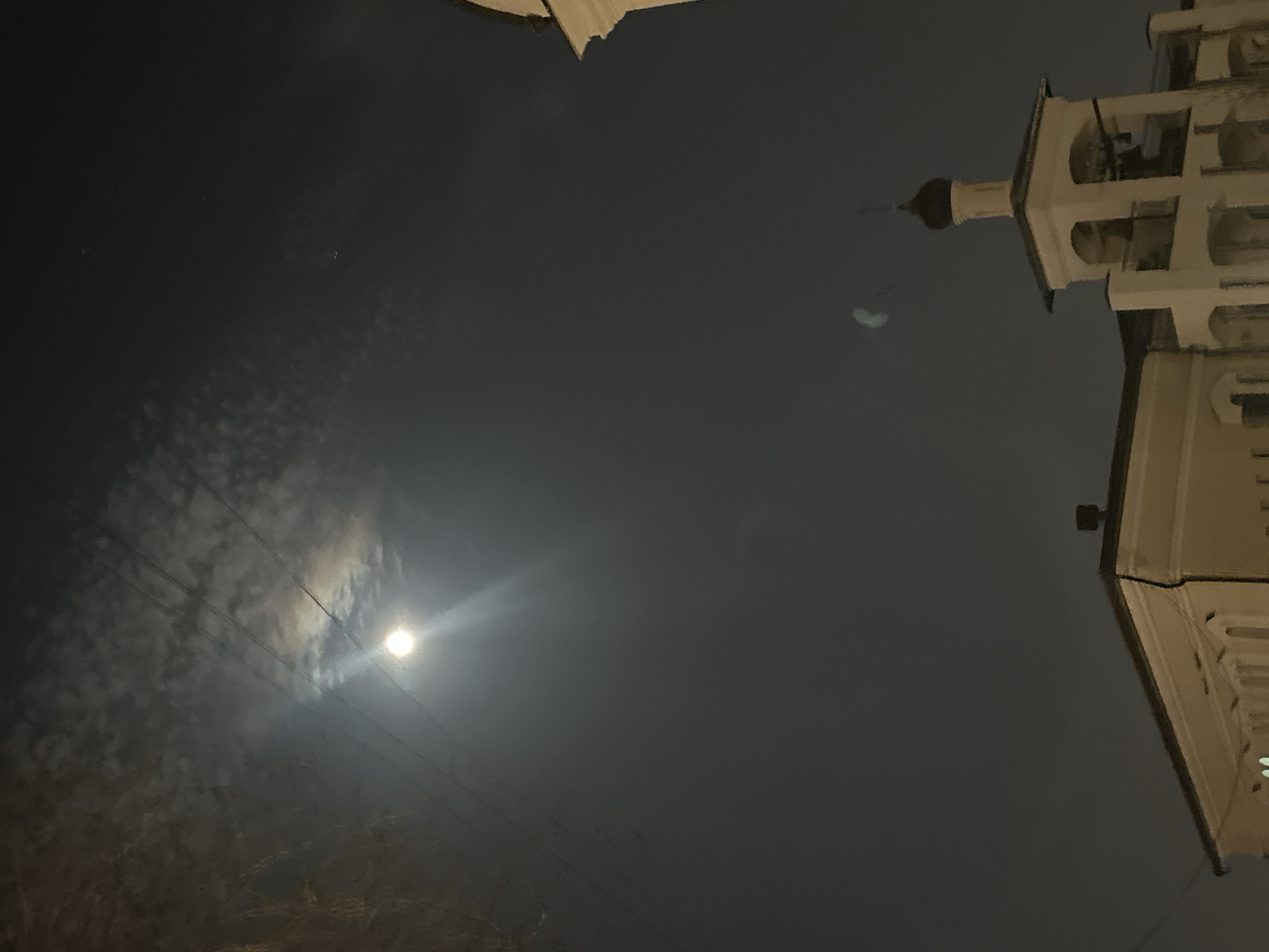 The image depicts a nighttime view, seemingly in Moscow, Russia, with a cloudy sky. The moon shines brightly through the clouds, casting a noticeable glow. Electrical wires stretch across the lower part of the frame. The distinct architectural features of a Russian Orthodox church tower and building are visible, characterized by their white facade, tiered structure, and traditional design elements. No people or interactions are discernible in the scene.