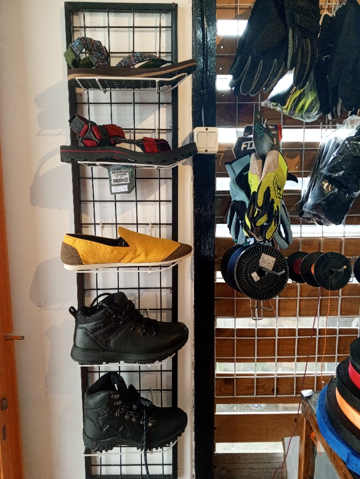 This image depicts an interior retail space in Baza, Myanmar (Burma), featuring various merchandise displayed on wall-mounted racks. On the left, a black metal grid rack with white wire shelves holds five individual footwear items: a pair of brown sandals with patterned green and brown straps on the top shelf, a pair of black sandals with red straps on the second shelf, a single mustard yellow slip-on shoe with a brown heel on the third shelf, a single black hiking boot on the fourth shelf, and another single black hiking boot with laces dangling on the bottom shelf. A product tag hangs below the second shelf of sandals. To the right, a dark vertical beam separates the left display from another grid display area. A white electrical switch plate with two switches is mounted on this beam. The right display section features multiple pairs of gloves, including black motorcycle or cycling gloves at the top, and lighter blue/grey and yellow/black gloves (some with a visible "FOX" logo) hanging lower down. Below these gloves, several spools of wire or cord (black, red, and other colors) are suspended from hooks on a grid. In the lower right corner, a stack of colorful spools or rolls of material (blue, black, red, orange) rests on a wooden surface, partially visible. The background behind the right display shows horizontal wooden slats or blinds, suggesting a window. The overall environment indicates a store specializing in outdoor, adventure, or general merchandise.